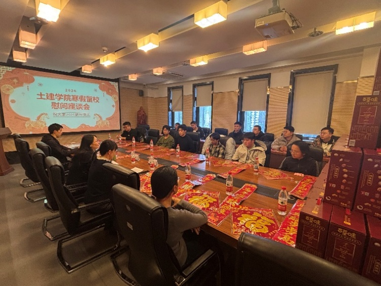 座谈会上,学院领导与同学们进行了亲切交流。详细询问了同学们的寒假生活规划、学习科研进展以及留校期间的实际需求,并向全体留校学生及家人致以诚挚的问候与新春祝福。